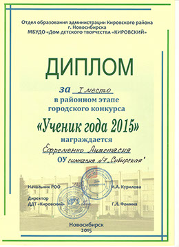 Анастасия Е., учащаяся 10 «А» класса МАОУ «Гимназия №7 «Сибирская», стала победителем районного этапа конкурса «Ученик года», который проходил с 29 октября по 6 ноября 2015 года.