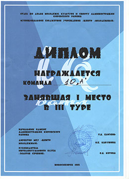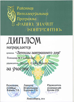 Творческая группа 10 "А" класса приняла участие в районной интеллектуальной игре "Равно, значит конгруэнтно". По итогам IV туров команда "Легенды завтрашнего дня" получила диплом участия. Интеллектуальная игра проходила в IV тура с сентября по апрель. 26 команд из школ района приняли участие в этом увлекательном мероприятии.