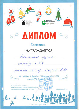 Вокальная группа учащихся 6 "Б" и 6 "Д" классов приняли участие в вокальном конкурсе, который проводила областная библиотека совместно с Гёте-залом. По итогам конкурса обучающиеся заняли III место и стали участниками заключительного мероприятия, посвящённого Рождеству.